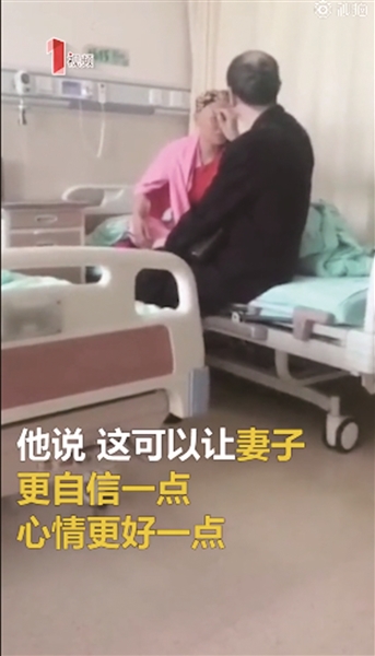 四川省肿瘤医院,郭先生妻子因病化疗半年,一头秀发全部掉光,眉毛也逐渐稀疏。病榻前,郭先生每天早上为她画眉梳妆、整理衣着。郭先生:这可以让妻子更自信一点、心情更好一点。