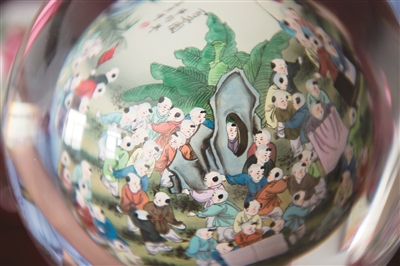 不仅如此,她绘制的图案也越来越复杂。“比如这个画着百子图的水晶球,就是我画过的作品中结构比较复杂的一个。”王非所说的这个作品,创作于2016年。画面主要由众多小孩构成,需要七八种颜色组合完成。