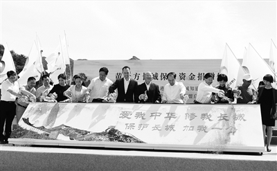 8日,万里长城保护志愿服务联盟启动仪式在延庆区八达岭长城举行。活动当天,黄廷方基金会副主席、香港信和集团副主席、北京市政协委员黄永光向中国文保基金会捐赠长城修缮资金1000万元,用于延庆长城67-69号敌楼及边墙的抢险加固。延庆区发起万里长城保护志愿服务联盟,向游客发出“保护长城,加我一个”的志愿服务邀请,来自河北省张家口市和北京市延庆区、怀柔区、密云区的志愿服务队共同参与了启动仪式。本报记者 陈艺 摄影报道