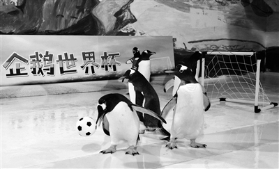 世界杯开赛之际,企鹅也来凑热闹。昨天,黑龙江哈尔滨极地馆的6只极地企鹅分成两队,上演了一场萌味十足的“世界杯”比赛。图为极地企鹅在“世界杯”比赛中。 新华社发