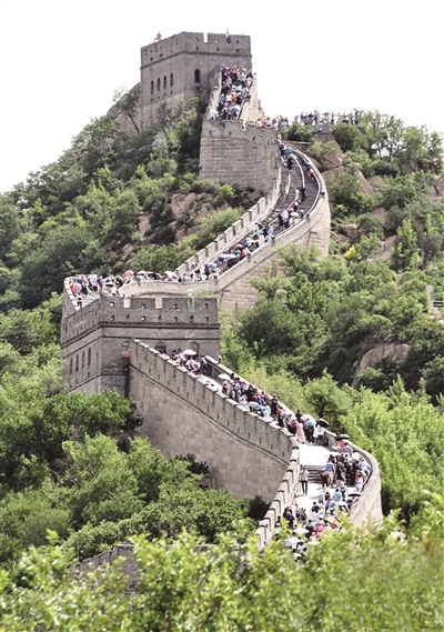连日来,位于北京市延庆区的八达岭长城进入旅游旺季,日均接待国内外游客超过2万人次。图为6月10日游客在北京延庆区八达岭长城游览。(新华社)