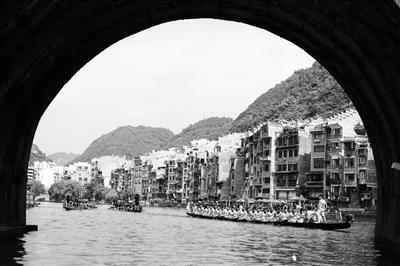 6月18日,在贵州省黔东南苗族侗族自治州镇远县阳河上,当地群众在传统龙舟赛上赛龙舟。当日是端午节,各地举行多彩民俗活动迎接节日。 新华社发