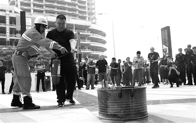 昨天,丰台区卢沟桥乡联合公安、安监、消防、城管、燃气等部门在商业广场举办了安全生产宣传咨询暨“燃气安全进万家”活动。当天,乡专职消防队联合恒泰进行火灾模拟救援演习,并就居民家庭常见的油锅起火事故的处置进行演示,向群众讲解了灭火器使用方法、初期火灾扑救要领,切实提高全民的安全意识。本报记者 陈艺 摄影报道