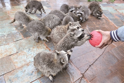 近日,位于昆明的云南野生动物园举办“动物们的端午节”活动,工作人员将坚果和饼干等食物放入漏食球内,制成“圆形粽子”,让游客向阿拉伯狒狒和小浣熊投食。图为游客在喂食小浣熊。