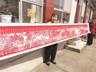 随后一个多月的时间,屈广英查看了有关张择端的资料,想象他创作时的意境,一点点,把他的作品用剪纸手法呈现出来。功夫不负有心人,历时三百多天,屈广英终于完成剪纸版的《清明上河图》——约六米多长的剪纸画卷!