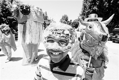 6月24日,美国洛杉矶举行面具节,传统艺术家、青年团体等通过面具制作、舞蹈、音乐表演和游行等表达对祖先和传统的敬意。 图为人们身穿表演服装在街上游行。 新华社发