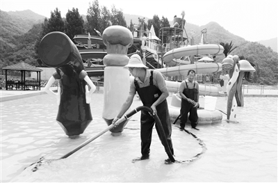 昨天,在密云人间花海,员工在景区内新竣工的“水寨里”,仔细地清理水池里的落叶、沉淀物。记者了解到,现在来人间花海消夏避暑的城里客越来越多,为了给游客提供一个清洁、清凉、养眼的舒适环境,园中的清洁工都要身穿工作服,冒着酷暑巡视山间、海面、沙滩,随时随地清理卫生。