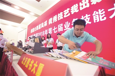 据了解,北京发行集团每隔两年就会组织一次业务技能大赛。“今年的技能大赛共设置图书推介、英语服务技能、微信推送编创、手绘pop设计、售书连续作业、图书花样造型设计和综合业务知识这些项目。”北京发行集团人力资源处副处长周方介绍。