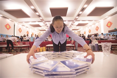 如果说图书花样造型设计比赛带给观众美感的体验,那么售书连续作业则带给人们速度的震撼。机器扫码、用纸将图书打包、核对钱数……一连串的动作选手们十分娴熟的完成着。