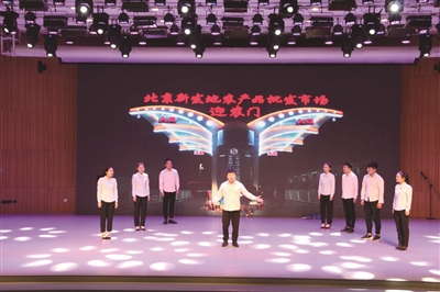 “走上台,笑开颜,齐欢唱,新发地走过三十年!三十年,多变化,新发地越来越壮大。库房高大货场宽,车水马龙人声喧。产品交易忙不停,品种齐全好繁荣。新发地三字金灿灿,已经是,首都的一张新名片。对,首都的一张新名片……”