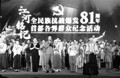 7日晚19时,在卢沟桥桥头,北京市委宣传部、丰台区委区政府共同主办了“江河铭记”——全民族抗战爆发81周年纪念活动。此次纪念活动包括情景诗朗诵、歌舞、抗战歌曲合唱、街拍微视频播放等形式,既有《抗争》《回望延安》情景舞蹈,还有《那些名字》《致敬英雄》等名家朗诵,唤醒了人民对于历史和英雄的记忆。