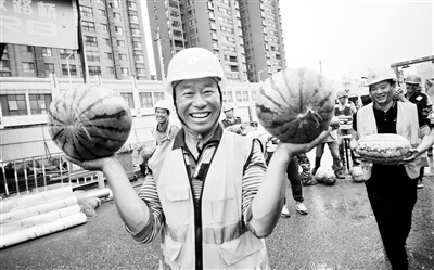 昨天,北京市政路桥总承包二部西安地铁六号线项目部为一线施工人员送去西瓜等清凉解暑品,为他们增添工作动力。西安地铁丈八六路站主体结构正在紧张施工中,目前已完成总量的82%,计划9月中旬全部完成。今年,总承包二部将款项下发,分布在全国各地的项目部将根据自身特点为一线施工人员发放清凉物资。本报记者 边磊 于佳 摄影报道