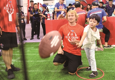 7月12日,第九届中国玩博会北京站(简称北京玩博会)在全国农业展览馆开幕,共有国内外210个玩具品牌的上万款新品展出。据悉,此次玩博会将持续至7月15日。图为一名小朋友在北京玩博会上体验橄榄球游戏。