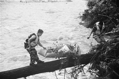 救援官兵迅速行动,由一名经验丰富的官兵先行过独木桥,携带绳索在对岸树上做好支点。随后,其余救援人员使用多功能担架,将村民急缺的食品、药品、照明工具等物资放在担架上固定好,由两名救援人员从独木桥上护送过去。独木桥仅仅只有40厘米宽,只能勉强容纳一人走过去,救援人员需要两人协同配合携带沉重的物资一点点挪到对岸。