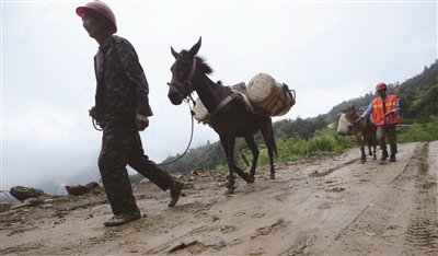 丹江口市是北京对口支援地区,也是南水北调的水源地。在隶属于丹江口市的盐池河镇,雨后泥泞的山路举步维艰。老乡赶着骡子,以最快速度向山上走去。头天的一场大雨将坡度几近40度的临建路冲得松散凹陷,即使皮卡这样动力十足的机动车也无法开到最上面的施工现场。但是,279省道盐池河镇至房县最后路段打通不能停工,机械设备需要的柴油必须保证随时送到最上面的工区。怎么办?雇骡子!