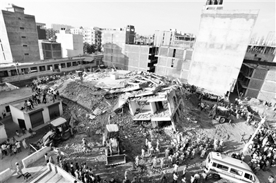 印度北方邦沙阿贝里村7月17日晚发生一起两栋楼房倒塌事故,一栋6层在建楼房倒塌,撞向毗邻的另一栋4层楼房,造成至少2人死亡,当地警方估计仍有20多人被埋。 图为7月18日,在印度北方邦沙阿贝里村,救援人员在楼房倒塌事故现场工作。