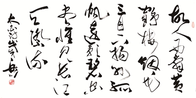 王岳川早年专攻颜楷,用笔取势筋骨厚重,追求浑厚磅礴的大美。其后转向二王行草,用笔行中带草,不激不厉,颇富文人韵意,再后取苏之酣畅意态和米之风樯阵马,结体稳中富险而又真率自然。自上世纪90年代,他全力攻草,潜心王献之,融入自家性格,使得书法既有文人情怀的温润,又有专家练达的风骨。