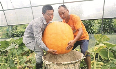 近日,重庆云阳县江口镇双龙村蔬菜基地收获巨型南瓜,这种南瓜比一般的南瓜要大10倍以上,重量达87公斤,需要两个壮汉才能抬走。据介绍,这些南瓜的日常种植管理和普通南瓜无异,从开花到成熟只需要1个月时间左右,一个大棚只能种10到12株,食用味道不错,也可放到家里观赏。
