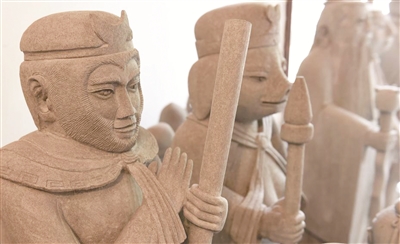 只有小学文化的他从影视剧和小人书中汲取灵感加上石匠技艺,在近50年时间里,雕刻出四大名著中的经典人物。图为近日73岁的牟登德在重庆家中展示自己的石刻作品。