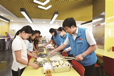此外,安全方面也是暑期职工子女托管班特别关注的地方。午餐继续延用上一次办托管班合作的餐饮公司,餐盘餐具都有专门的卫生老师进行清洗并放入消毒柜消毒;为预防夏季进入高发期的手足口病等传染疾病,每天孩子们到校进教室前都会先进行体温测量。