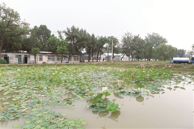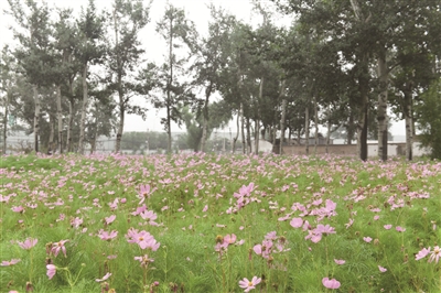 圆明园公园北墙外,贴着北五环厢白旗桥西南角的辅路向西走,大约四五百米后,路左侧有一扇洞开的大门。沿着土路上的车辙往里走,一大片林荫花海闯入眼帘。地面上,一大片粉色,一大片紫色,一大片白色,大块大块的波斯菊花田铺展开来,嫩绿的叶子、娇艳的花朵让人心情愉悦。花田中间,还有一个个荷塘,尽管荷叶还没有铺满水面,但小荷才露尖尖角,让人充满期待。花海之上,是枝繁叶茂的成排的大杨树和散落的大柳树……一派田野风光。