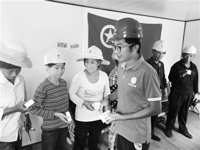 近日,北京住总二公司燕郊水榭花城项目团支部为高温下奋战的钢筋班组、木工班组等人员送去藿香正气水及绿豆汤等解暑药品饮品。本报记者 崔欣 通讯员 黄大平 顾树青 摄影报道