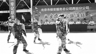 近日,北京市公安局西站分局指导市保安服务总公司西站分公司80余名保安员,进行了业务技能训练和比武演练,内容包括班队列、安检专业技能、消防技能、警犬训练、反恐处突等五大类22项,以保障暑期运输安全。图为保安员正在进行业务技能比武演练。
