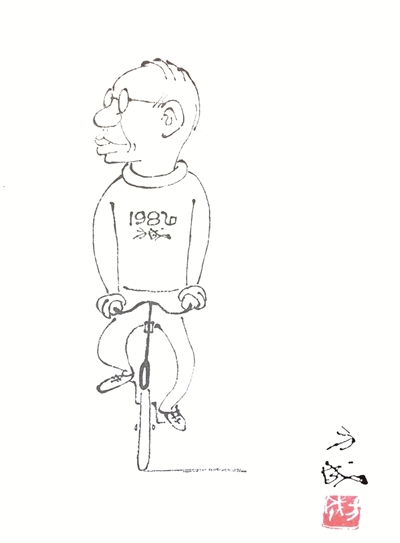 他曾画过一幅自画像,画的正是他骑自行车的“雄姿”,说不上威风凛凛,倒也优哉游哉。他骑在上面,颇显得轻车熟路。他没有往前看,而是脸侧向一旁,厚厚的嘴唇紧抿着,眼睛注视着某一个吸引他的场面。