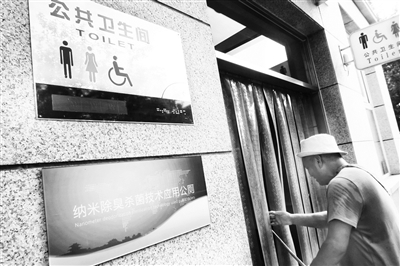 8月10日,记者来到崇文门内大街与小报房胡同交界的一处公厕,发现位于公厕正门左手边的“公共卫生间”招牌下面多了一行“本公厕应用纳米光分解除臭杀菌技术”的小字。走进公厕,即使在夏日也没闻到臭味。