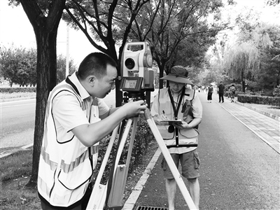 在北五环附近的安立路辅路上,作为参赛选手,测量员吕志平架好脚架和仪器,然后进行微调数据,最后将数据报给身旁的裁判员。一共六个点位,测完一个他马上扛着近15公斤的仪器奔向下一处。