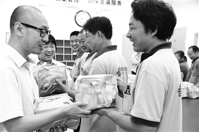 8月16日,暑期末伏第一天,虽然有点秋高气爽的感觉,但天气依然炎热,特别是到了中午骄阳似火,为投递员的出班投递带来了许多辛苦。为了进一步做好暑期安全生产工作,让广大投递员既要做好投递工作,又要提高防暑降温意识,北京邮政工会特为朝阳邮政的投递员们准备了清凉包。本报记者 边磊 摄影报道