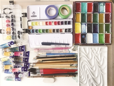 除了重要的颜料、纸张和画笔以外,还有很多其他的工具也不可缺少。比如调色盘、水溶性彩铅、留白液、牛胆汁、胶带、牙刷、吹风机、喷壶、棉签等,这些小东西都可以让我们绘画的时候得心应手,当然最重要的是要大胆的画,不要害怕,初学者可以尽量多的临摹自己喜欢的画,也可以照着身边的花花草草练习。多尝试一些。