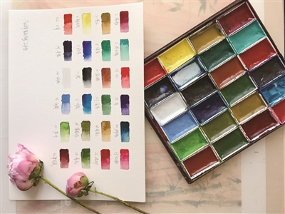 这一款属于半透明水彩,有一定的遮盖力,这个是我最常用的颜料,它更倾向于国画颜料,溶色会差一点,色彩很鲜亮浓重,除了一些传统国画颜色,还有一些比如金银或者珍珠色的配色。