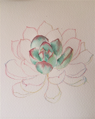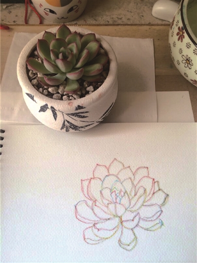 1.用水溶性彩铅照着多肉植物画出一个简单线稿,这一步要做到尽可能形准。