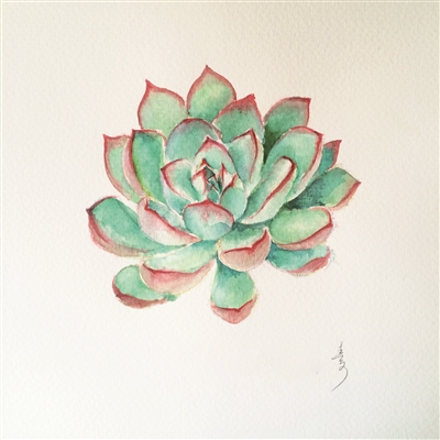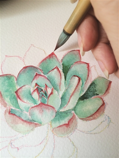 2.观察多肉的颜色变化以及明暗关系,从中间的部分开始画起。为了方便可以准备两支笔,先铺淡绿色的底色,等它半干的时候再用另一支笔画出红色的部分,这样红绿交接的地方就可以自然融合了。