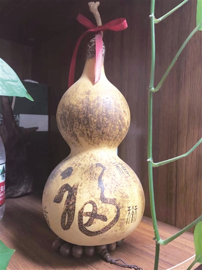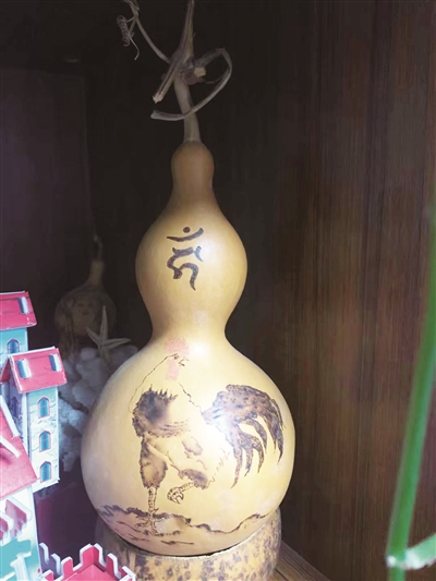 “很多朋友来了看到说很喜欢,就让他们拿走了,从没提过钱。”他说,自己在2010年前后做过几年婚庆,那时候,他有一些时间,就集中做了一大批葫芦烙画。除了送自己的亲朋好友,很多通过工作认识的新人看到他做的葫芦烙画非常喜欢,就试着请他帮着做,王艳山欣然同意,这样找他做葫芦的人越来越多。送给新人的一般都是烙画生肖图案,比如有一对新人是属鼠的,他应邀做葫芦烙画,烙了一只老鼠抱着钱袋,表达了对新人的美好祝福。