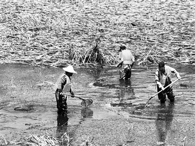 昨天,南沙河河道打捞工人身着橡胶衣进入河道内进行水草清理作业。据现场工作人员介绍,今夏高温雨水多,河道里的水草疯长,为了保证水质,他们定期要在河道中徒步打捞水草,不断监测水质。