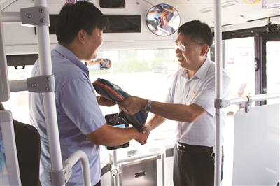南法信镇党委副书记、总工会主席杨进军来到北京骏马客运有限公司,亲手将“清凉包”送到奋战在公交一线的司机师傅们手中,叮嘱他们一定要保重身体,合理安排作息时间,做好防暑降温工作。
