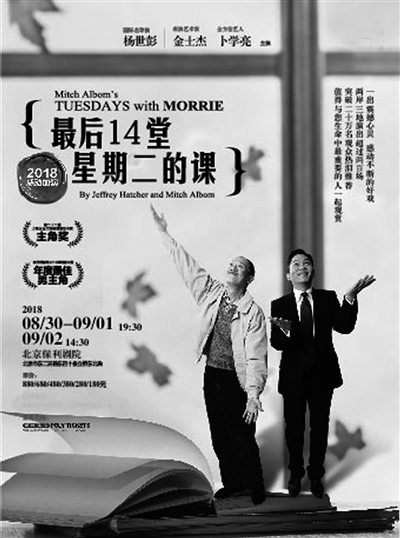 《最后14堂星期二的课》 改编自美国知名作家米奇·艾尔邦的畅销书《相约星期二》。这是米奇的传记体回忆录,回忆了他与大学老师莫利·希沃兹的交往。莫利得了“肌萎缩侧索硬化症”,也称“渐冻人”,莫利患病后没有一点儿悲伤,而是希望能和米奇聊天,谈谈他对人生、生死、学习、生活、交友、处事的看法,在此过程中,米奇的精神世界受到极大的震动。莫利死后,米奇把这些聊天录音整理成书,出版后引起巨大轰动,连续十四周列美国畅销书排行榜头名。而米奇把畅销书的收入,用来偿还莫利治病时欠下的巨额债务。这是一个感动了亿万人的故事。后来,米奇自己把其改编成话剧。果陀剧场的《最后14堂星期二的课》即是根据米奇的话剧剧本演出的。