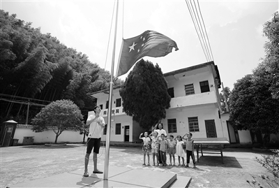 2018年是陈云根老师执教的第50个年头,在倍感欣慰之余陈云根萌生退意。他说,有了“接班人”,我将不再有后顾之忧。图为陈云根(后)和黄文春(前)带着全校6名学生升国旗。 新华社发