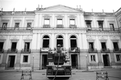 9月2日晚,位于里约热内卢市北区、拥有2000万件藏品的巴西国家博物馆发生火灾。火势在3日凌晨3时左右才完全得到控制。博物馆副馆长克里斯蒂安娜·塞雷若表示,幸存的藏品应该不到总数的10%。巴西联邦检察院发布公报说,已要求联邦警察对国家博物馆火灾及造成藏品损失的原因和责任展开调查。 图为一辆消防车停在火灾过后的巴西国家博物馆外。
