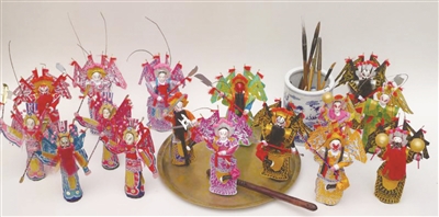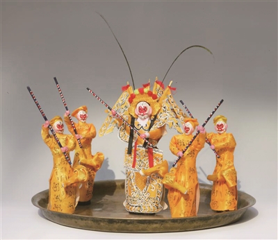 冰心的散文《我到了北京》中,有这样一段生动的描写:“这是一种纸糊的戏装小人,最精彩的是武将,头上插着翎毛,背后扎着四面小旗,全副盔甲,衣袍底下却是一圈鬃子。这些戏装小人都放在一个大铜盘上,耍的人一敲那铜盘子,个个鬃人都旋转起来,刀来枪往,煞是好看。”冰心提及的鬃人,又叫“铜盘人”或“盘中好戏”,如今被列为市级非物资文化遗产,第三代传承人是年近八旬的白大成先生。
