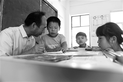 9月7日,在安徽太和县郭寨小学,郭岳(左一)在给学生批改作业。