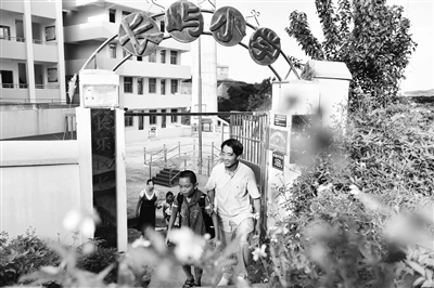9月3日,在长乐区长屿小学,王开佺、林珠金在放学后护送学生走出校门。