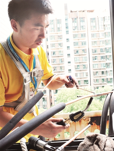 “空调安装作业需要2人组合共同作业,我和伙伴安装的最高楼层是42层,每年平均一组安装800台空调,一天最大工作量装13台,8年来我在北京安装了近万台空调,服务了几千户人家。”不善言谈的郑亚兵,说起这一组数据,言语中露出了一丝自豪。