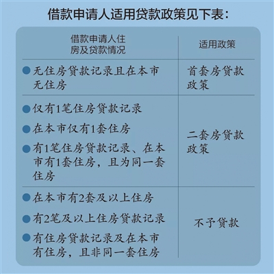 新政实施后,在二套房认定上将从此前的“只认房”升级成“认房又认贷”。借款申请人(含共同申请人)名下无住房贷款记录(包括商业性住房贷款、住房公积金个人住房贷款)且在本市无住房的,按首套房贷款政策办理;凡不属于首套房情形,被核定为是二套房的,按二套房贷款政策办理。被核定为有两套及以上住房的,不予贷款。按照新政,仅有1笔住房贷款记录;在本市仅有1套住房;有1笔住房贷款记录、在本市有1套住房,且为同一套住房这三种情况均按二套房政策贷款。在本市有2套及以上住房;有2笔及以上住房贷款记录;有住房贷款记录及在本市有住房,且非同一套住房均不予贷款。(下转第4版)