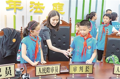 在少年法庭,小记者们还在法官的带领下参观了未成年人案件审判法庭,“法官妈妈”程乐以身边的案例为孩子们上了一堂生动的法治课,提示小记者们在学习和成长中要正确处理和同学们之间的矛盾,学法懂法,做一个守法的小公民。在模拟法庭,小记者们还穿上了小法袍,分别扮演审判长、人民陪审员、书记员、公诉人、辩护人等角色,在法官的指导下,坐上审判席,郑重地拿起法槌并敲响,进行一场模拟庭审,过了一把当“小法官”的瘾!
