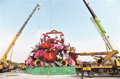 昨天,工人在天安门广场组装“祝福祖国”巨型花篮。目前,天安门广场花坛布置工作正在紧张进行,“祝福祖国”巨型花篮也渐现雏形。据了解,从2011年开始,“祝福祖国”巨型花篮就一直作为天安门广场中心花坛在国庆节期间向祖国献礼。根据今年的花卉布置方案,广场中心花坛仍以花篮造型为主景,花篮为钢架结构,可抗10级风;花坛顶高17米,篮盘直径15米,花坛底部直径50米。花篮里将布置有红掌、梅花、康乃馨、向日葵、兰花、月季等多种仿真花卉,寓意幸福吉祥。新华社发