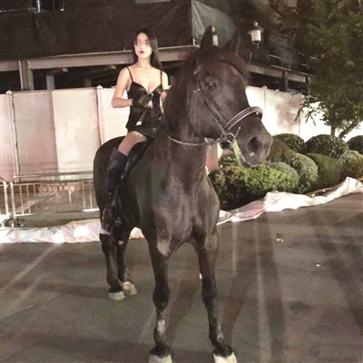 9月11日晚11点,一名长发年轻女子身穿黑色吊带衫、过膝长靴,骑着一匹深棕色高头大马由西向东,在延安路的机动车道上一路小跑,一辆辆机动车从旁驶过。一旁机动车上有人问“你们在搞什么吗?”,女子微笑回答:“没有啊,自己养的宠物啊。”目前警方已介入调查,马被暂扣。