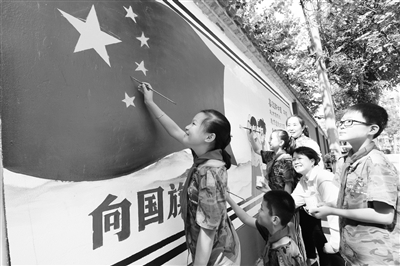国庆节前夕,丰台区南苑街道西宏苑社区组织社区在职党员、社区居民、中小学生在小区文化墙上精心绘制国旗,以此表达对祖国的热爱、对党的祝福。本报记者 陈艺 通讯员 史莉 摄影报道